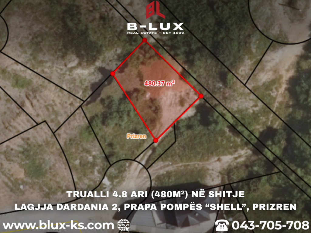 Ofrohet për shitje trualli me sipërfaqe 4.8 ari (480m²), i cili ndodhet në Lagjen “Dardania 2” (ish-Jaglenica), prapa pompës “Shell”, Prizren.